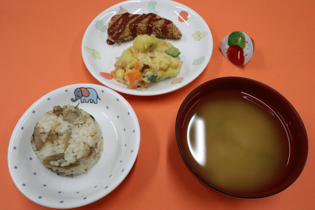 今月の誕生会献立は、炊き込みご飯、魚のフライ(オーロラソース添え)、さつまいものコロコロサラダ、お花麩のみそ汁、ミニゼリーです。